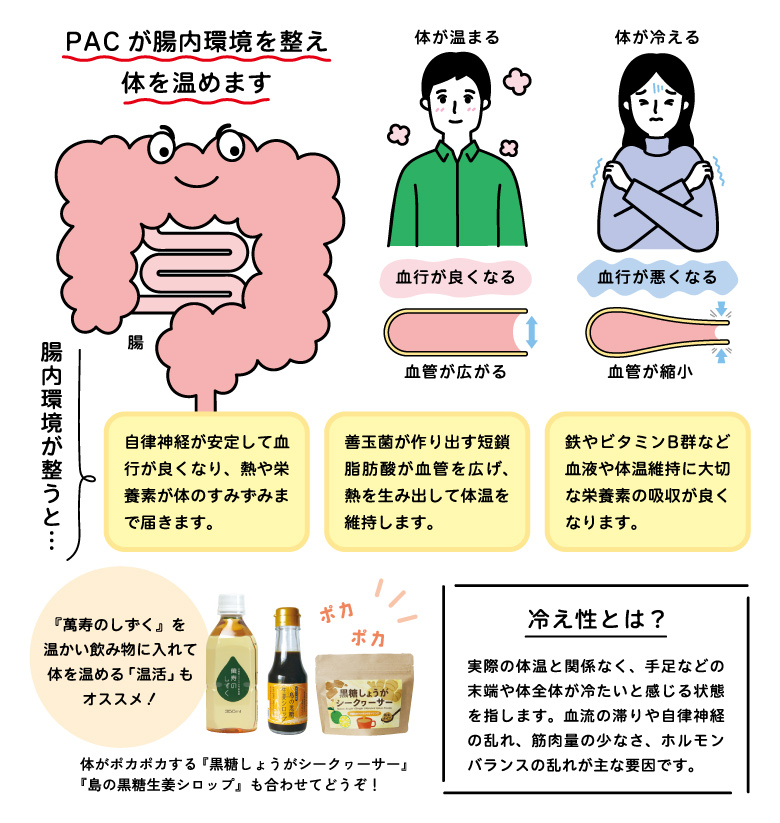 『萬寿のしずく』の健康成分「PAC(パック)」には腸を整える働きがあります。体の中心にある「腸」から血行をケアして、冷え知らずの毎日を目指しましょう。