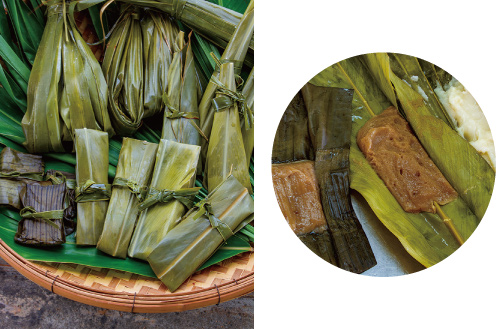 月桃、芭蕉、クバの葉などで包まれたムーチー。味も家庭によりさまざま