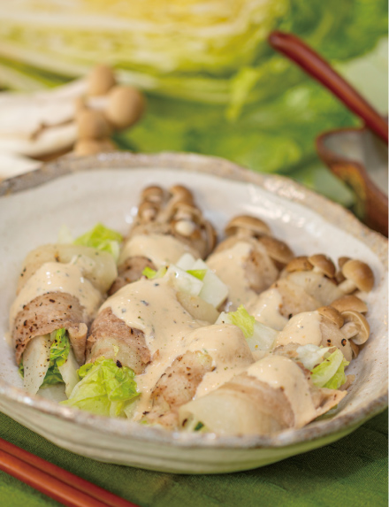 味噌とヨーグルトのソースでいただく白菜ときのこの豚バラ巻き