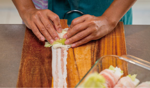 ① 白菜は1cm幅に切り、豚バラをひろげて白菜をのせて巻く。