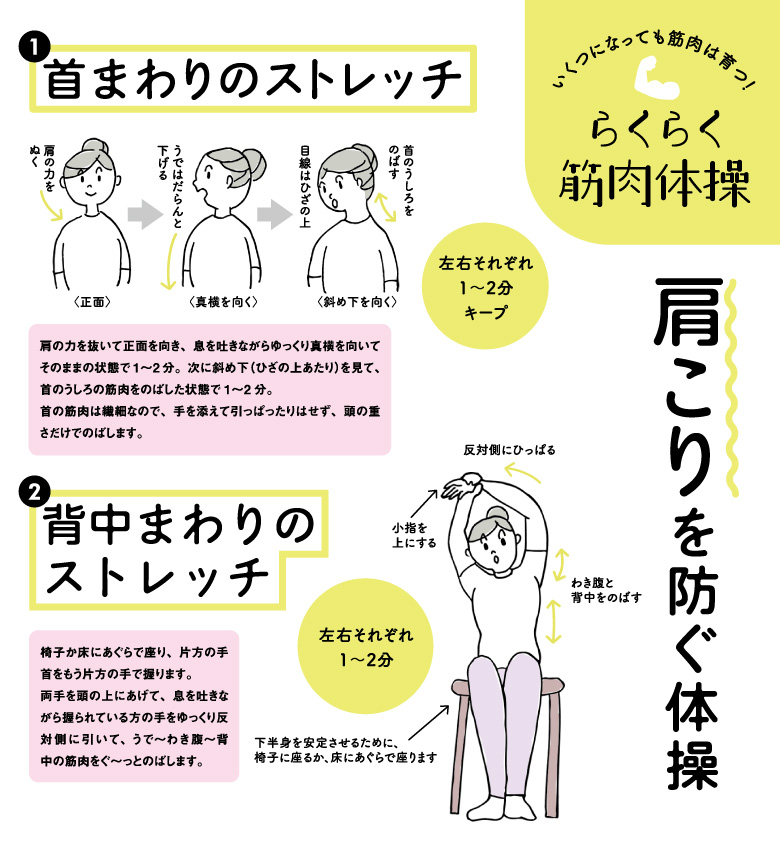 人の頭は約5~6kgもあり、その重さを支えている首と肩には常に大きな負担がかかっています。肩こりの原因は様々ですが、デスクワークや農作業などで下を向いたままの姿勢を長時間続けたり、運動不足で肩まわりの筋肉が凝り固まっていることも一因となります。スマホをよく見る現代人は無意識のうちに猫背になりがちなので、日頃から肩まわりの筋肉をストレッチしてほぐしておくことで、肩こりを防ぐことができます。