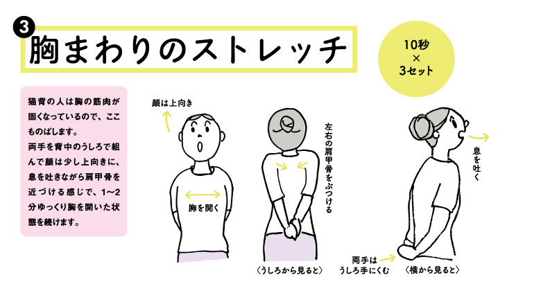 まず、首〜背中〜胸の筋肉を順番にほぐすストレッチを行ってから、肩まわりの筋肉を強くするエクササイズに移っていきましょう。